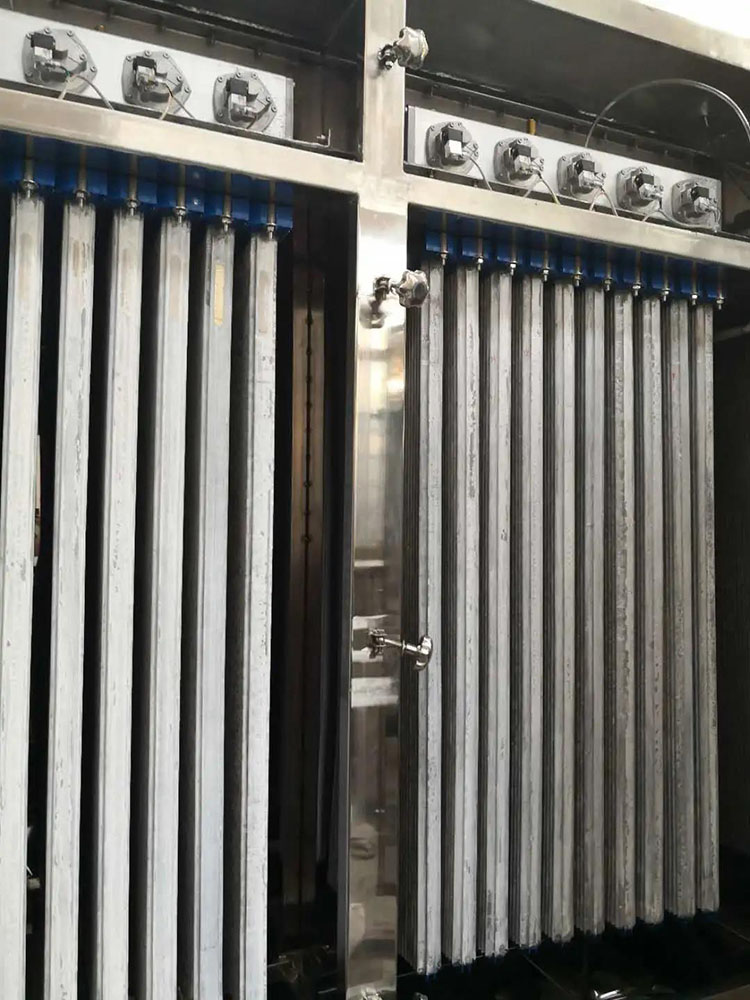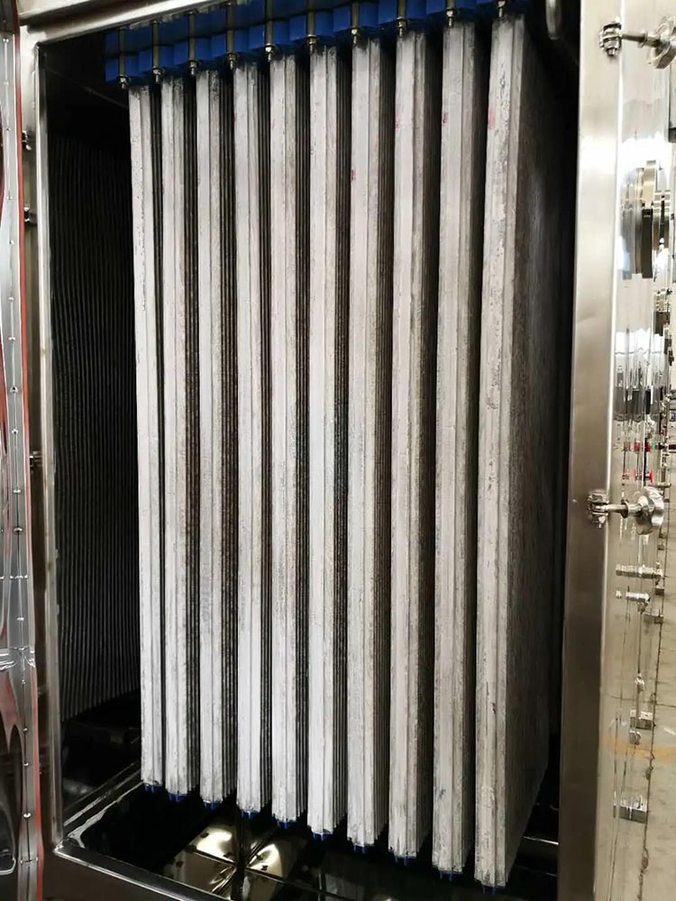 具體原理是含塵氣流通過(guò)塵氣入口處的導流板進(jìn)入中部箱體的塵氣室,通過(guò)燒結板凈化后的氣體經(jīng)風(fēng)機排出。隨著(zhù)被阻留在燒結板表面涂層上粉塵的增加,定時(shí)或定差壓工作方式的清灰控制系統將自動(dòng)開(kāi)啟快開(kāi)式脈沖閥,通過(guò)壓縮空氣來(lái)有效清除燒結板表面的粉塵,被噴落的粉塵在重力的作用下落入灰斗后排出。